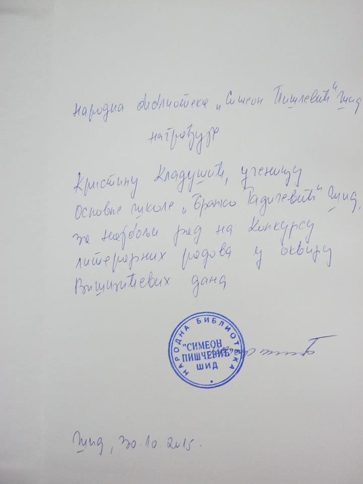 Ученица наше школе Кристина Кладушић на литерарном конкурсу градске библиотеке „Симеон Пишчевић”, поводом манифестације „Вишњићеви дани”, освојила је награду за најбољи рад.